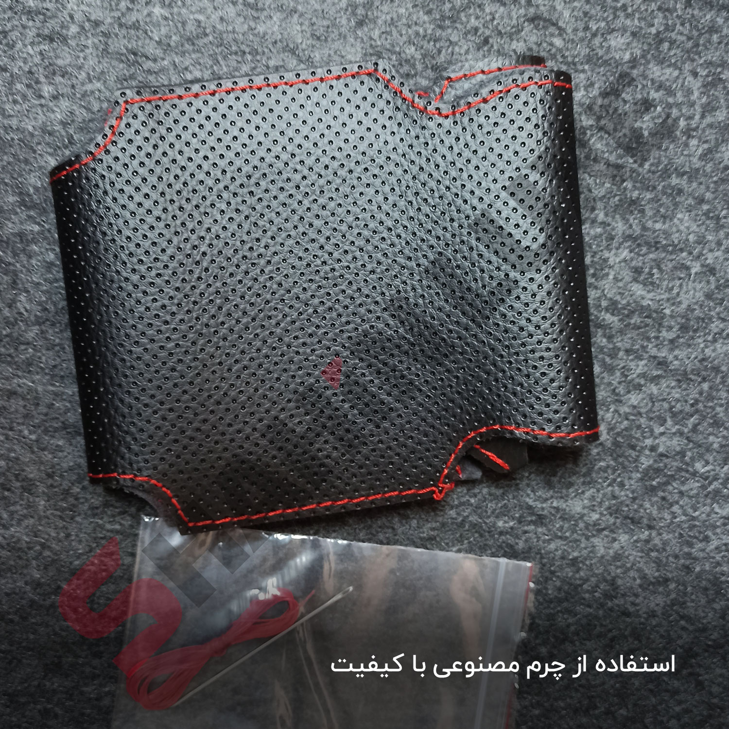این روکش فرمان از چرم مصنوعی ولی بسیار با کیفیت دوخته شده است و در بخش اتصالات آن سعی کردیم از پرس به جای دوخت استفاده کنیم که کیفیت بسیار بهتری دارد و به مرور زمان دچار پارگی نمیشود.