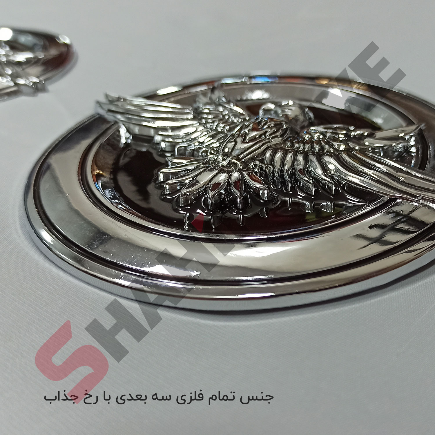این محصول با الهام از نام خودرو طراحی شده است و در مرکز دایره آن یک پرنده شاهین با نمایی خشن و چابک نقش بسته است. این محصول از جنس تمام فلز طراحی و تولید شده است و کیفیتی بسیار ایده آل دارد. این محصول در برابر باد و باران و رطوبت هیچ واکنشی نشان نخواهد داد و به جرات میتوان گفت کیفیت آن از آرم فابریک سایپا هم بهتر است.